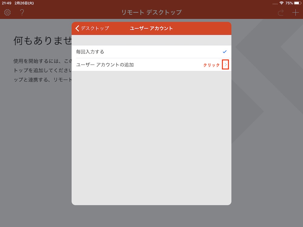 ユーザーアカウント画面で「ユーザーアカウントの追加」行の右端にある「>」をクリックします。