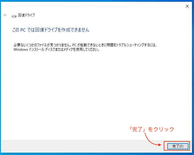 「このPCでは回復ドライブは作成できません」ダイアログ画面が現れ、失敗した事が表示されます。「完了」をクリックする。